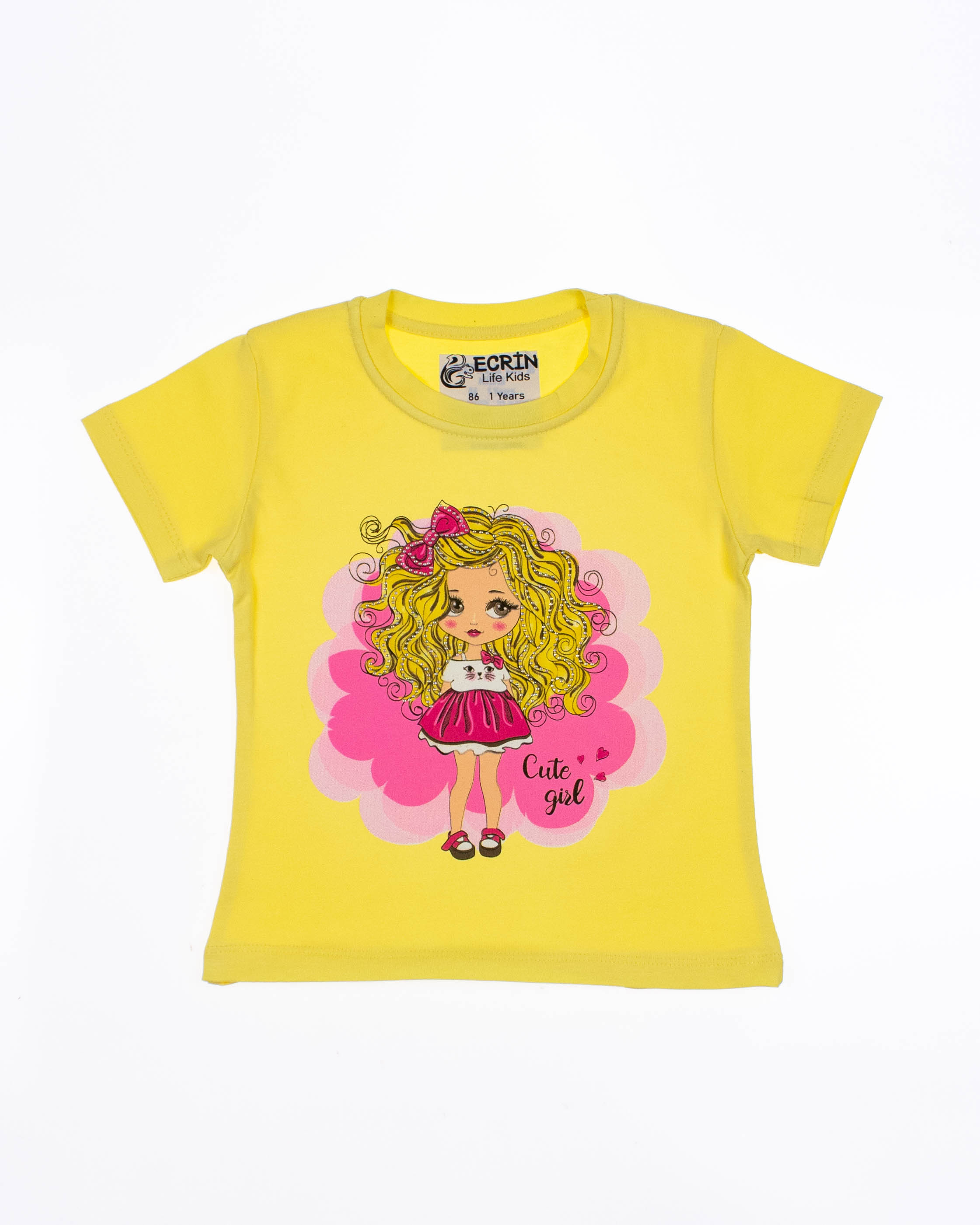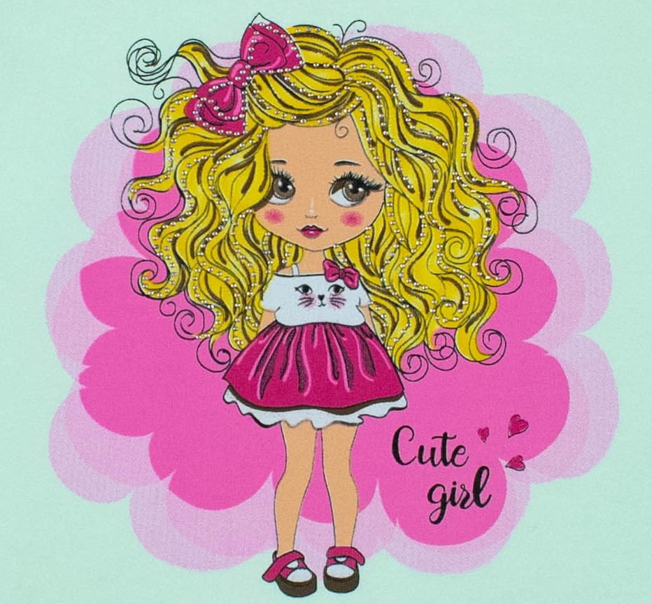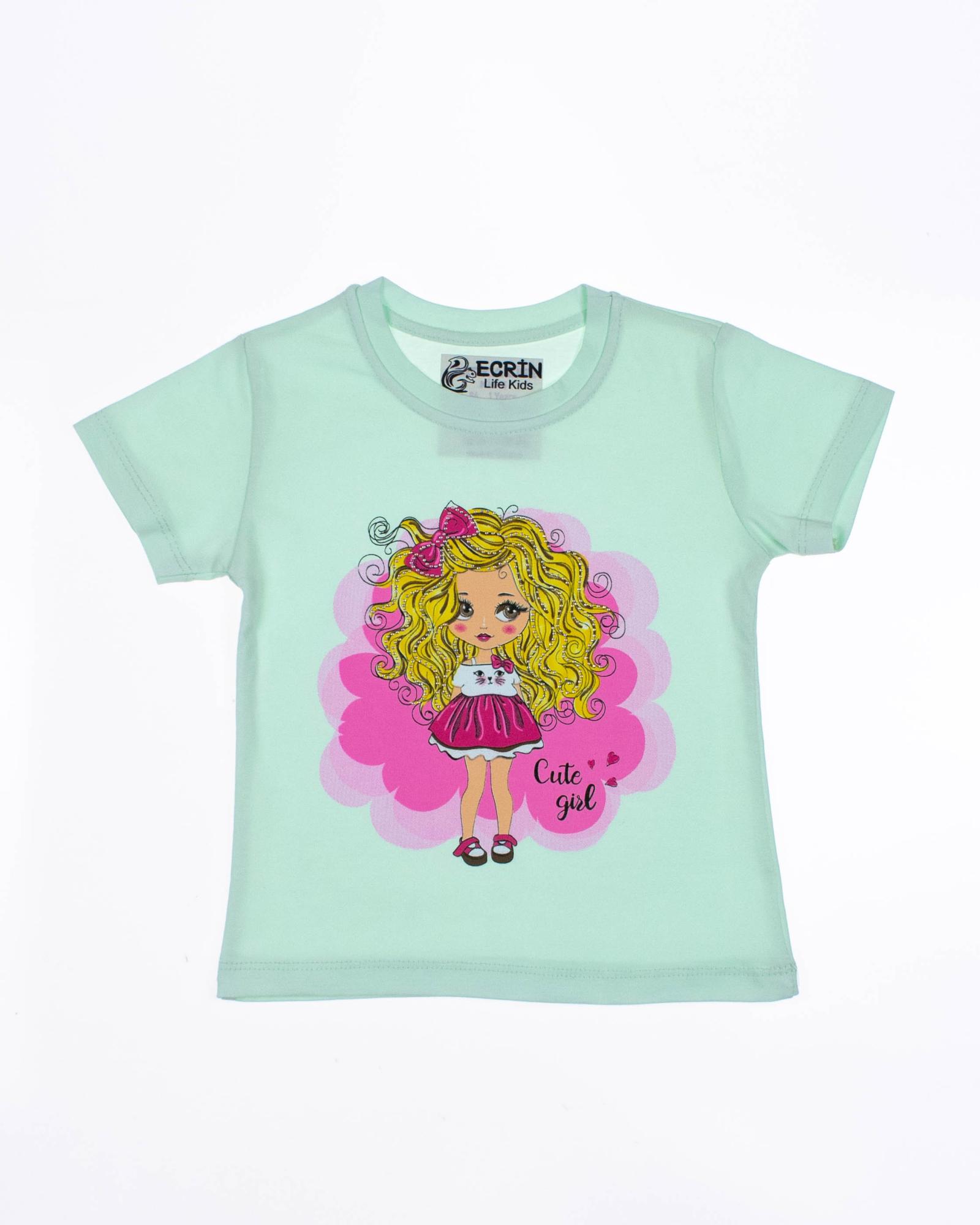 Футболка ECRIN для девочки оптом, производства Турция. Модель приталенного силуэта с короткими рукавами, милый принт украшен стразами.