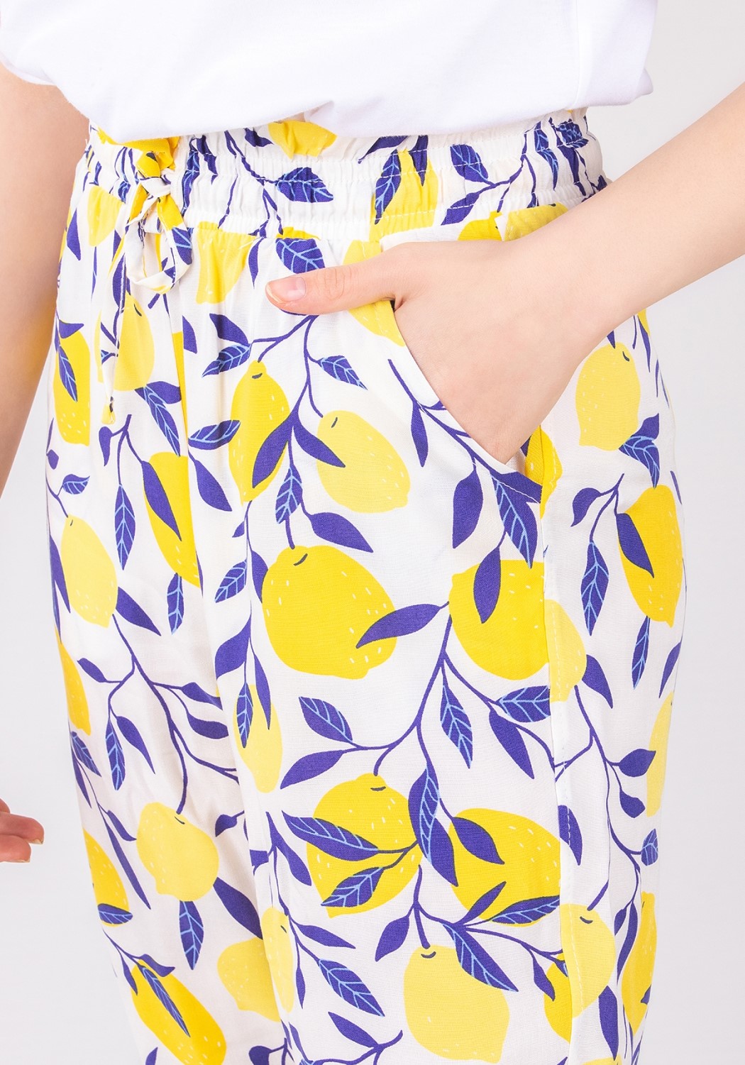 Прекрасный стильный костюм из двух предметов : футболки  и брюк из легкого штапеля . Край рукава оформлен воланом. Брюки с боковыми карманами на манжетах. Яркий и актуальный  костюм  будет незаменимым нарядом в летний сезон.
