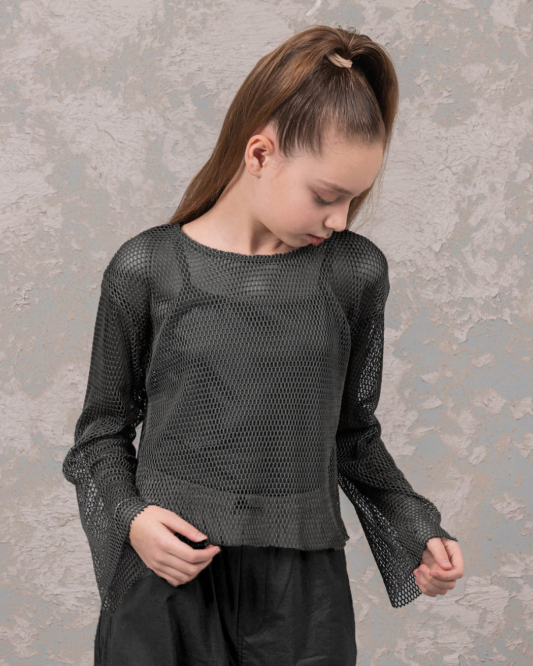 Сетчатый свитшот DMB свободного кроя оптом подходит для подростков в качестве сценического образа или одежды на каждый день. Модель с округлой горловиной и широкими рукавами без манжетов, умеренный оверсайз не сковывает движения, поэтому прекрасно подходит для занятий танцами. Свитшот в сетку станет отличным дополнением к любому гардеробу. С ним можно создать множество образов для праздников, вечеринок, фотосессий.