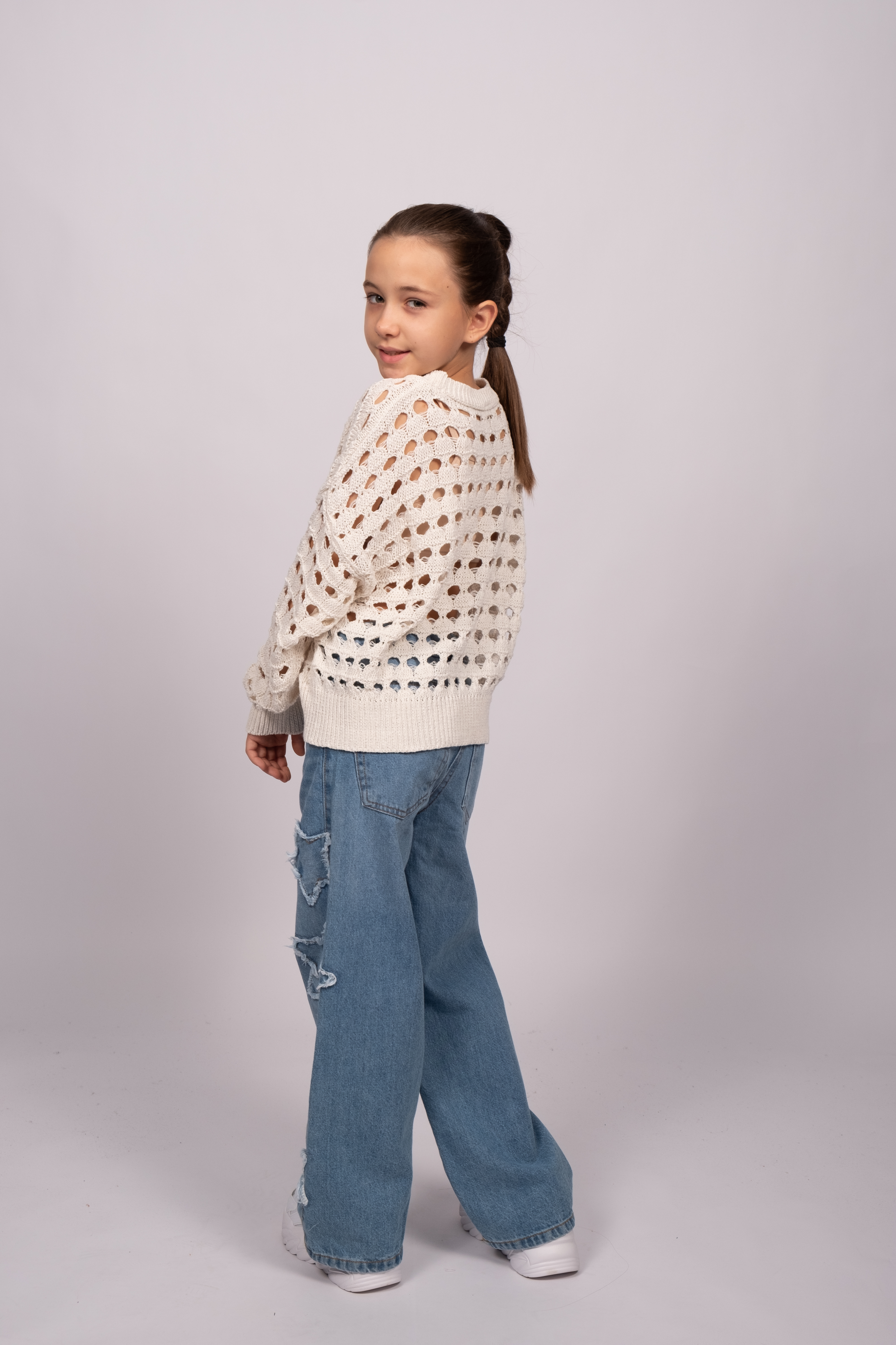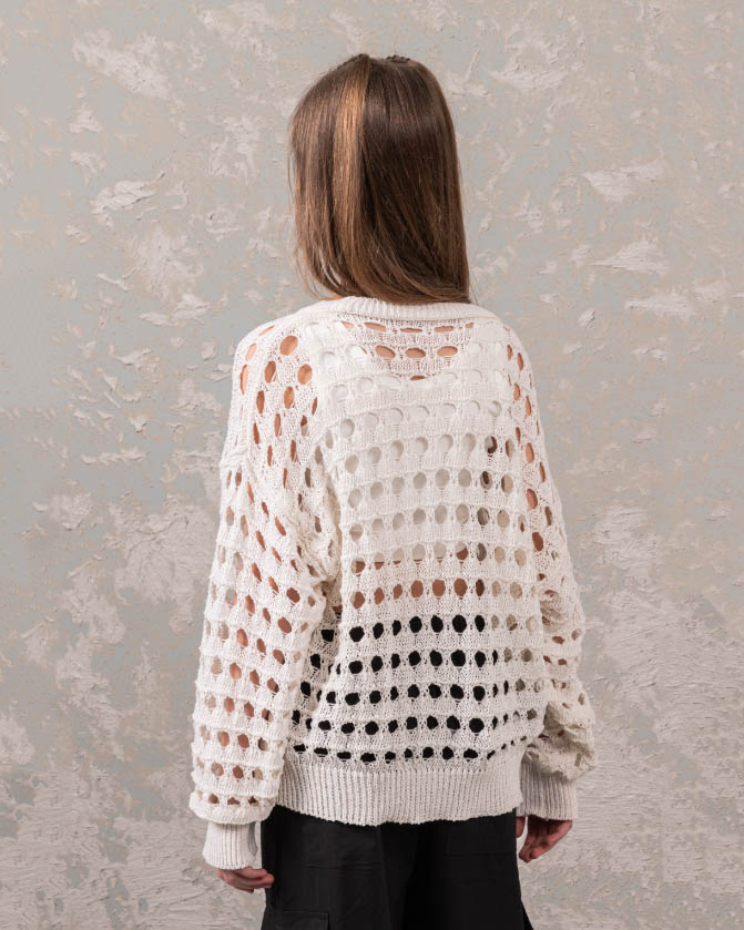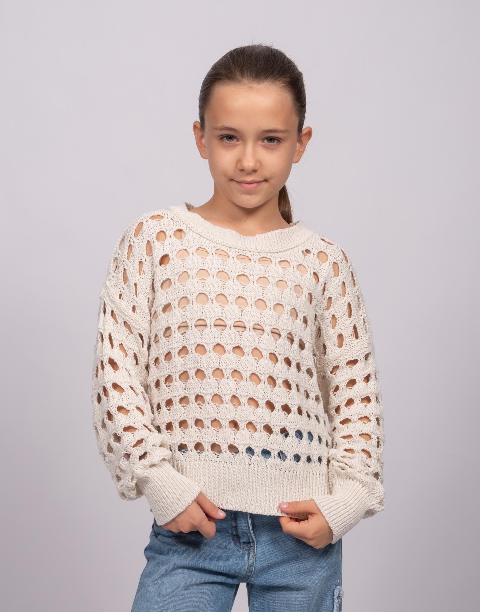 Джемпер DMB для девочек ажурной вязки оптом, выполнен из 100% хлопка. Свободный крой, круглый вырез горловины. Модель отлично сочетается с любой одеждой. Под низ можно надеть удлиненный или короткий топ в тон джемперу.