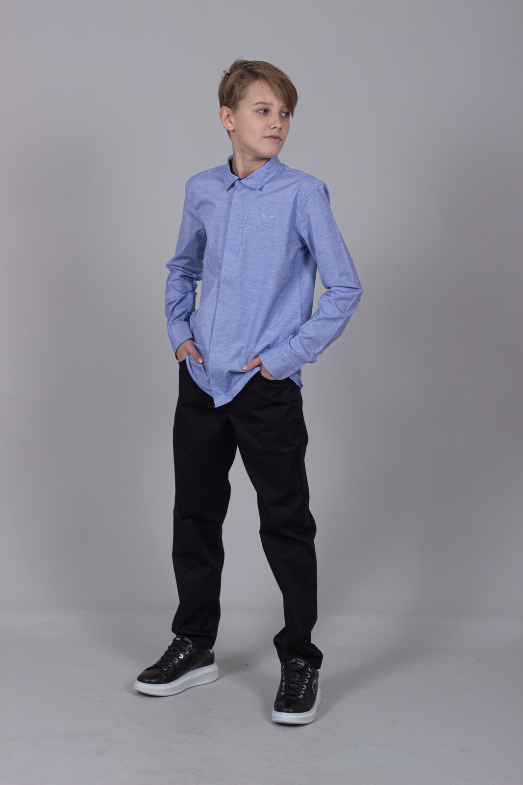 Рубашка для мальчиков прямого кроя с длинными рукавами и классическим отложным воротничком. Модель застегивается на молнию и кнопки.
