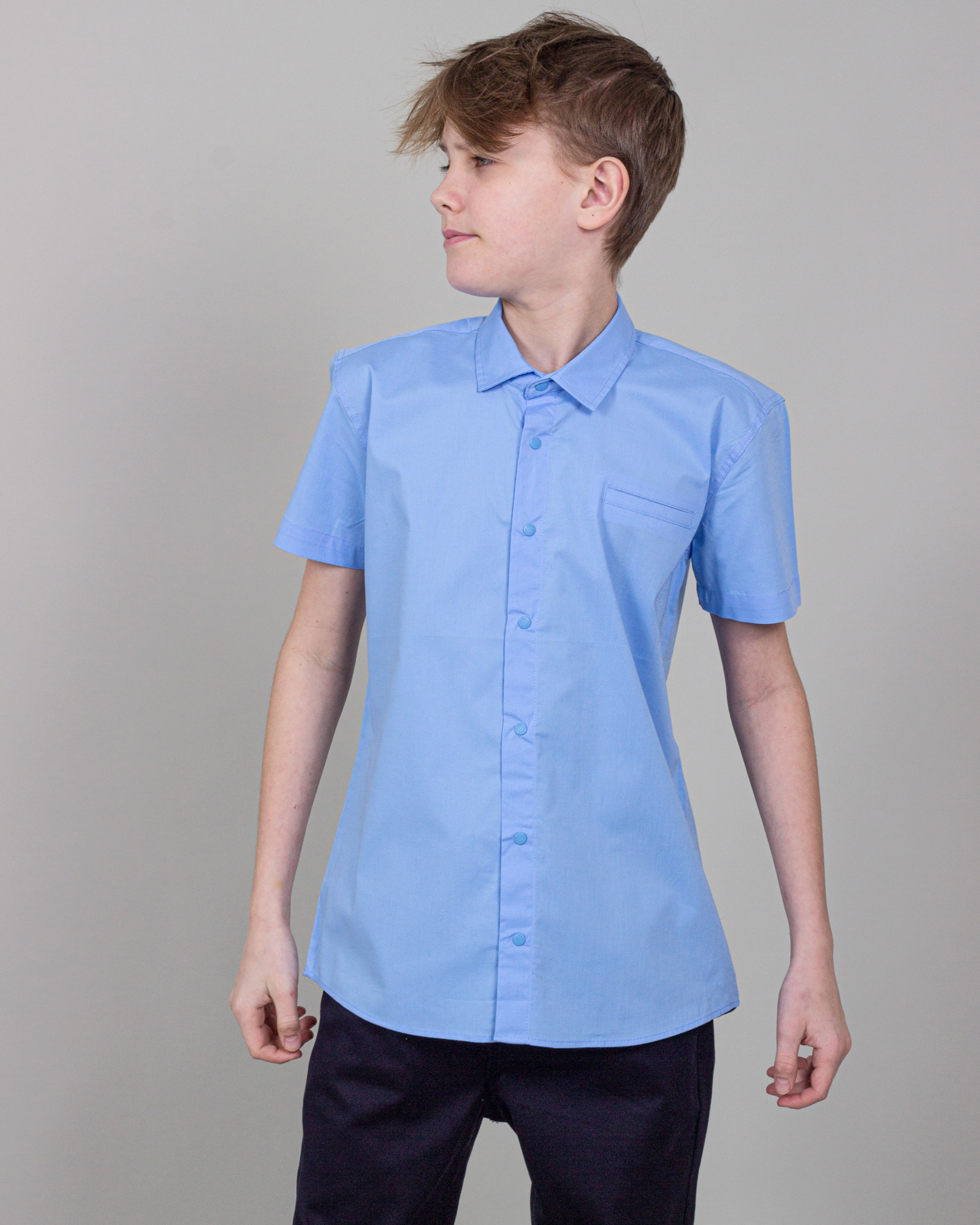 Стильная рубашка с коротким рукавом, застёгивается на кнопки. На груди — фальш‑карман.