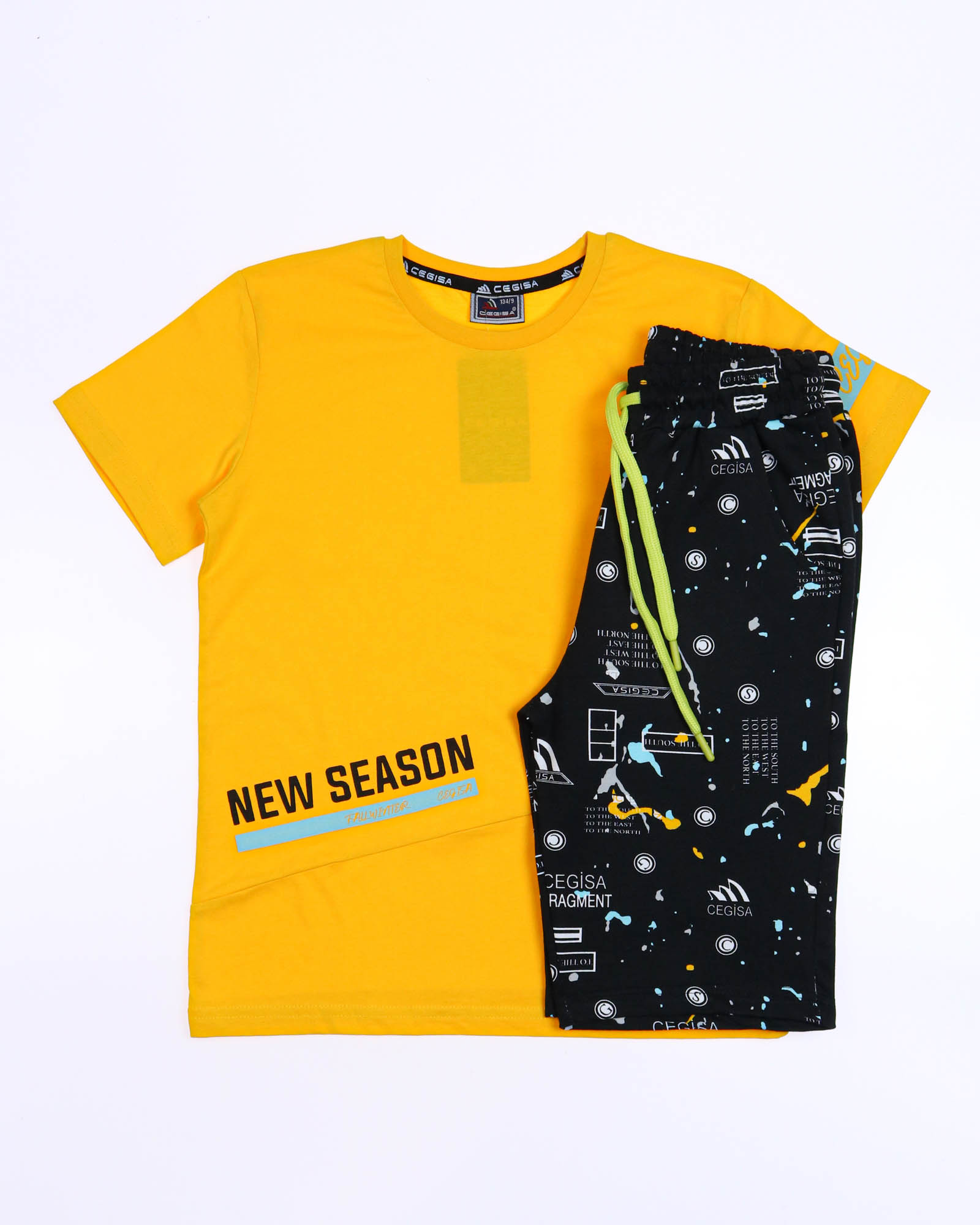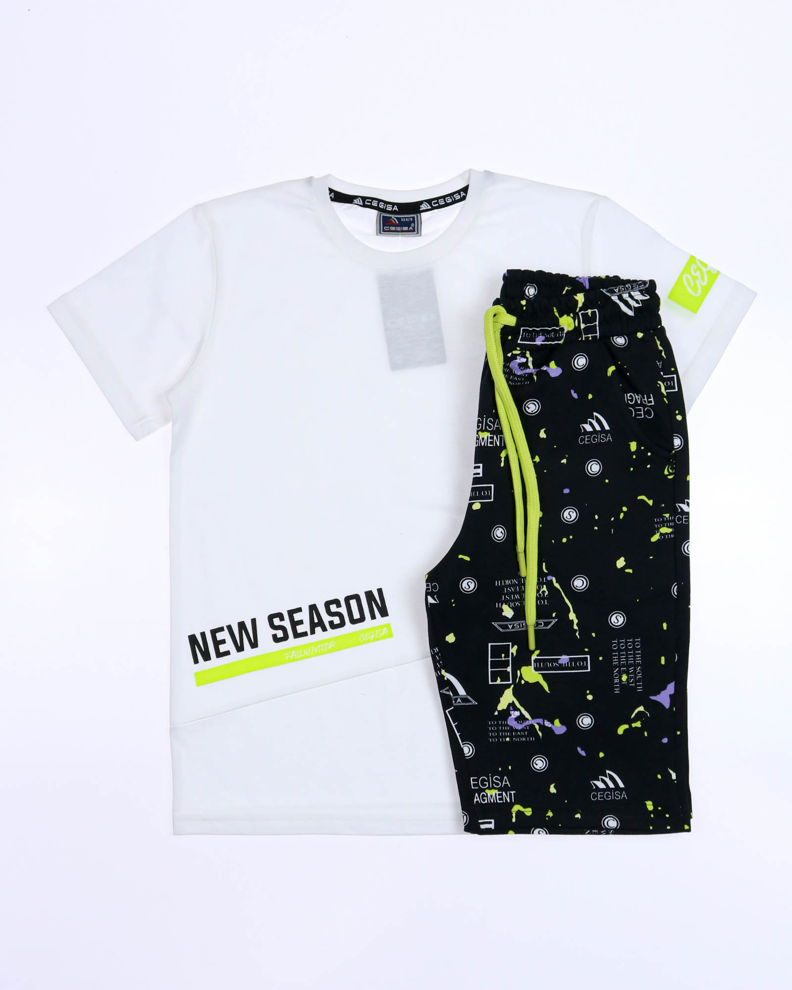 Трикотажный костюм CEGISA из хлопка оптом. Бриджи выполнены из футера 2х нитки (петля) с карманами, на эластичном поясе с регулируемым шнурком и оригинальным принтом. Футболка выполнена из кулирной глади, прямого кроя с округлой горловиной.