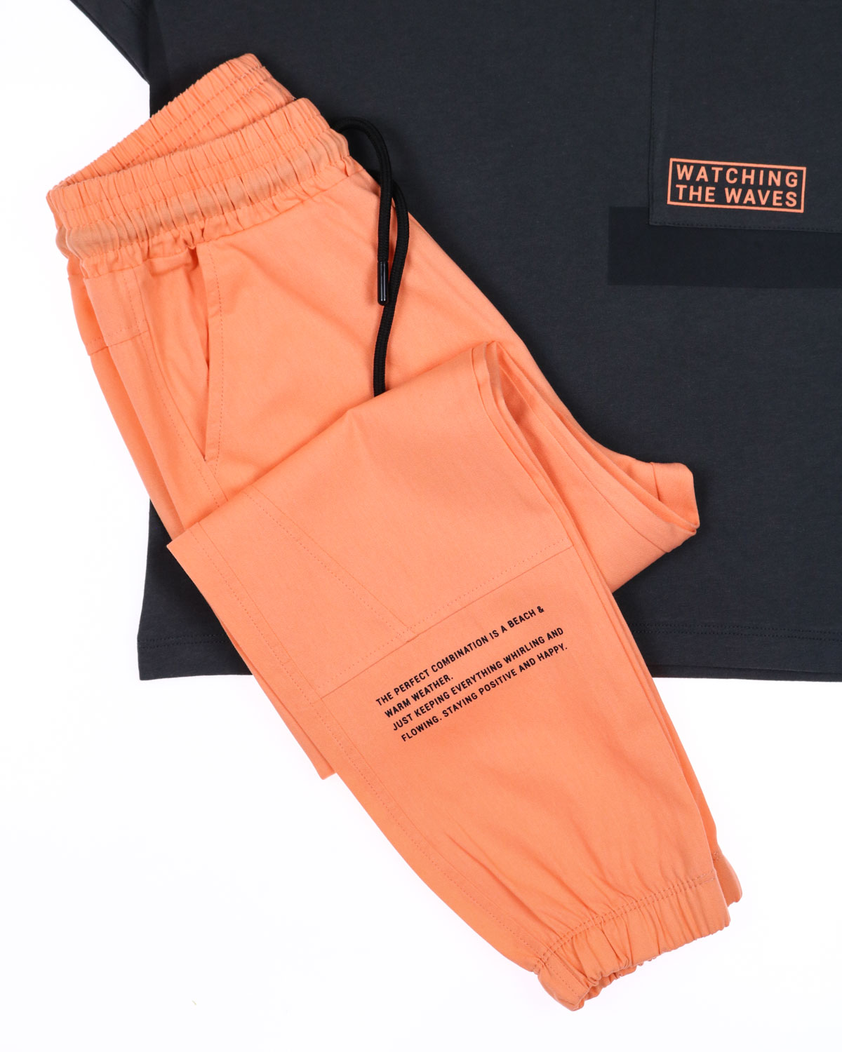 Летний костюм DMB оптом. Футболка прямого кроя с короткими рукавами, на груди пришит накладной карман. Брюки из хлопка без эластана с боковыми карманами. Пояс на резинке с функциональным шнурком позволяет ругулировать объем на талии, штанины на эластичных манжетах.