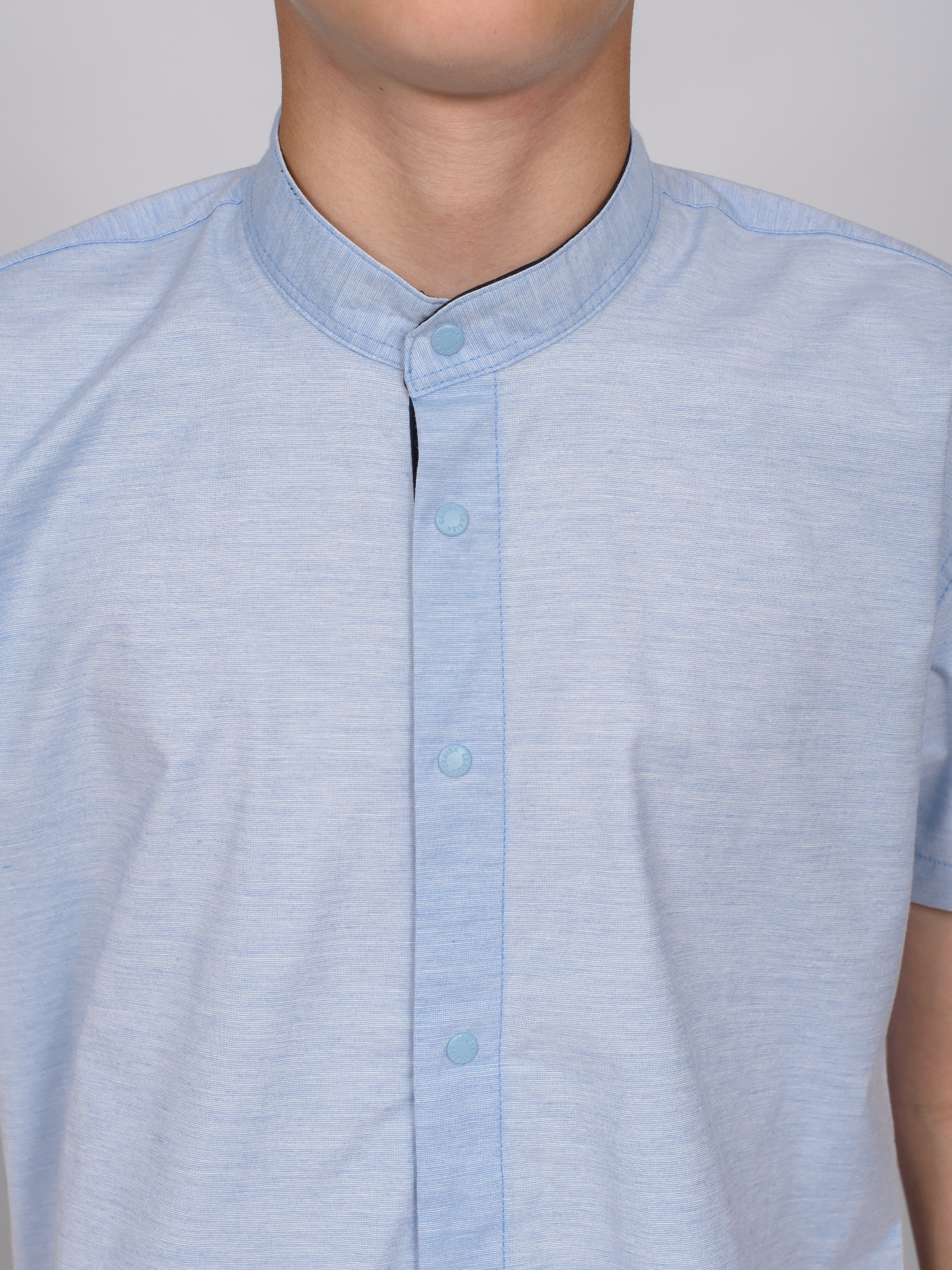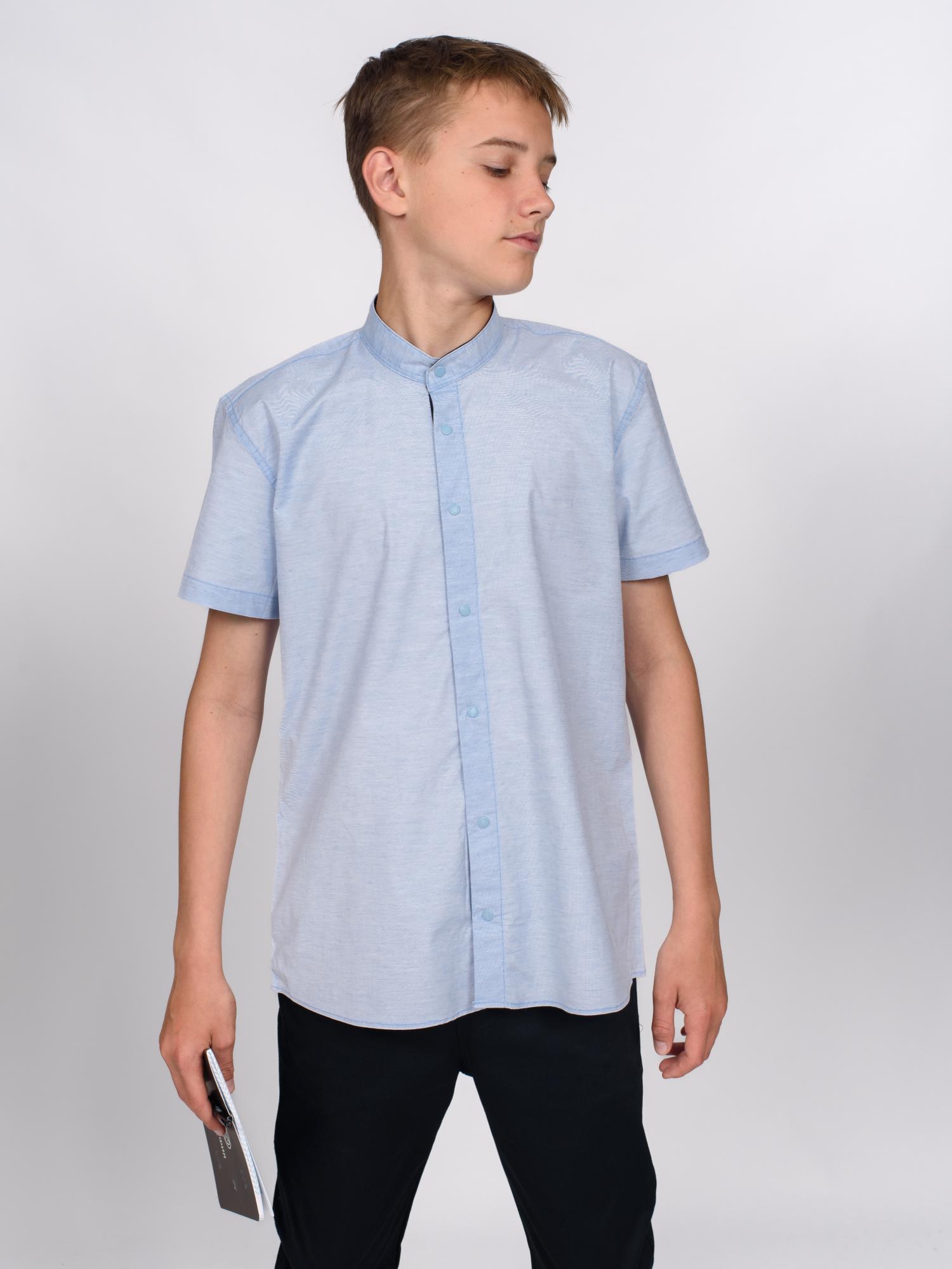 Школьная рубашка Cegisa оптом приталенного кроя с короткими рукавами, воротничком-стойка, застегивается на  кнопки. Воротничок и планка с внутренней стороны отделаны однотонной тканью темно-синего цвета.